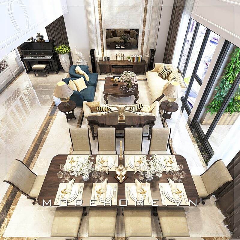 Thiết kế nội thất phòng khách liền phòng ăn phong cách hiện đại sử dụng tone màu trắng tạo cảm giác tươi mới và thoáng mát cho ngôi nhà