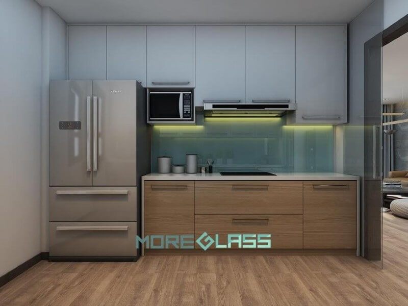 Trang trí mẫu kính ốp bếp màu xanh ngọc với không gian nhà bếp nhỏ ở chung cư.