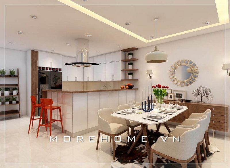 Bộ bàn ăn hiện đại, gọn gàng tiện lợi là lựa chọn hoàn hảo cho phòng ăn liền phòng bếp của không gian căn hộ chung cư.