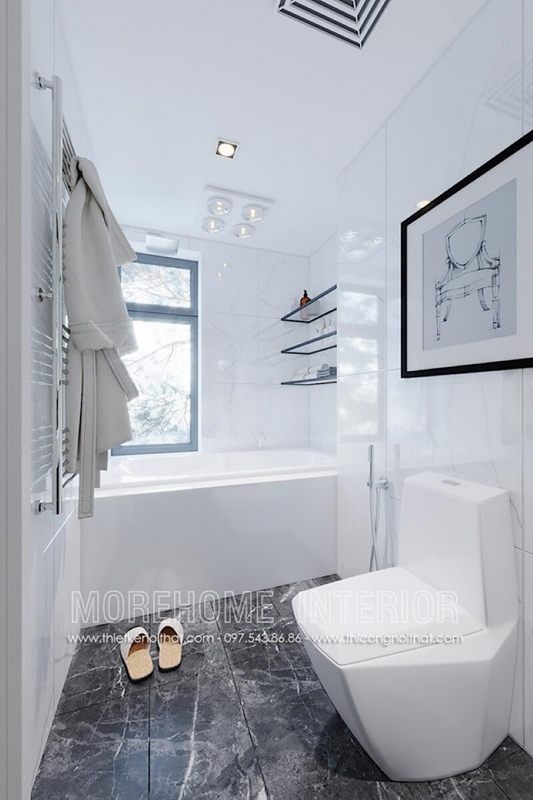 Phòng tắm sẽ trở nên ấm áp hơn vào mùa đông với đèn sưởi âm trần được bố trí ngay trên bồn tắm.