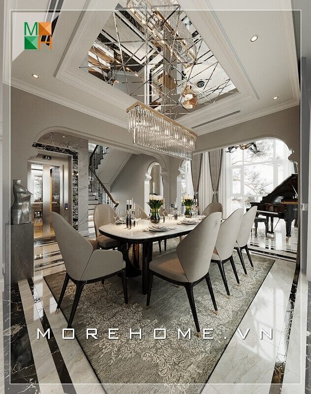 Sắp xếp nội thất phòng khách liền phòng ăn đẹp, sang trọng cho biệt thự, nhà phố tại Vinh, Nghệ An.