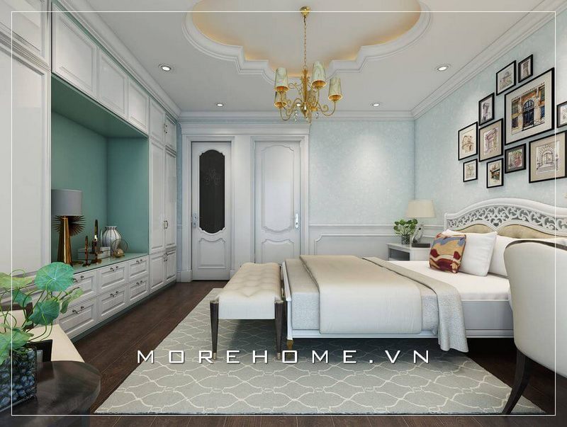 Thiết kế nội thất phòng ngủ gỗ công nghiệp nhẹ nhàng kết hợp tone màu trắng chủ đạo mang lại không gian nghỉ ngơi yên tĩnh mà không kém phần sang trọng