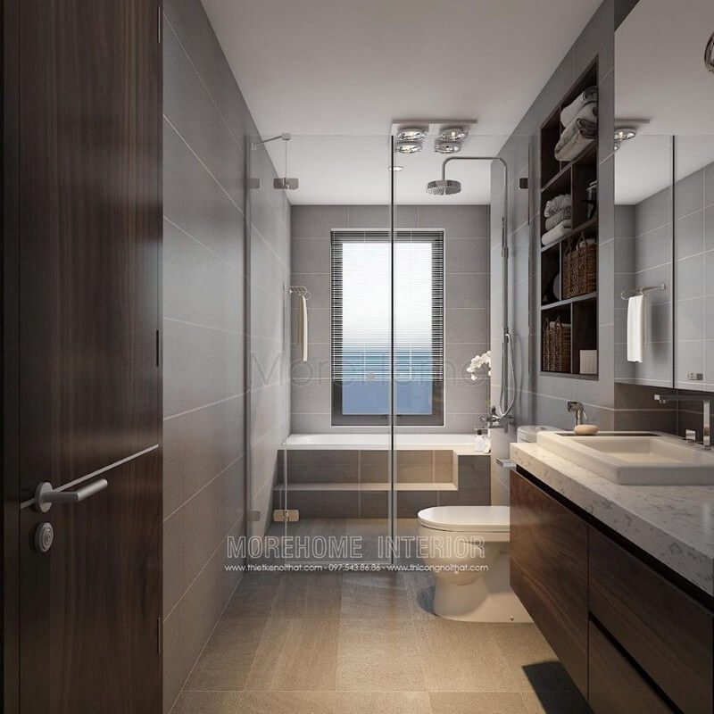 Bạn đang tìm kiếm mẫu thiết kế phòng tắm đẹp, sang trọng gam màu xám cùng chất liệu gỗ óc chó thì ý tưởng thiết kế nội thất phòng tắm tại biệt thự Vinhomes Imperia Hải Phòng là một gợi ý khá ấn tượng