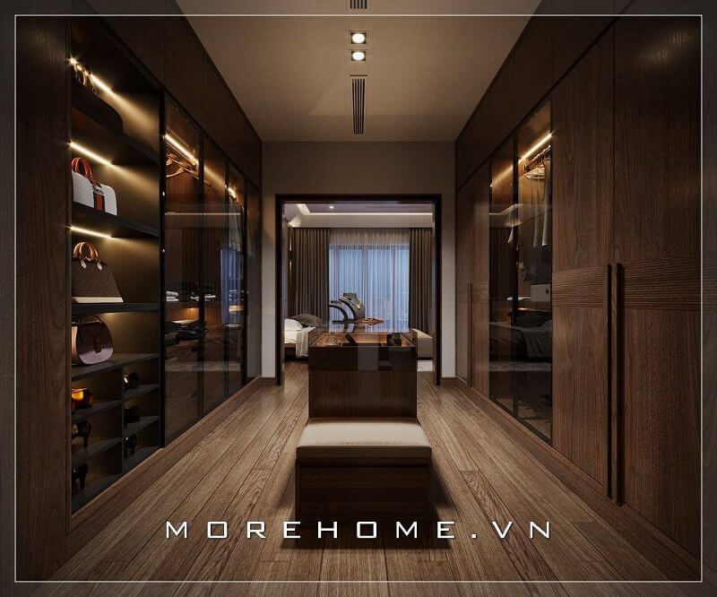 Mẫu thiết kế nội thất biệt thự sang trọng với không gian phòng thay đồ tông màu nâu trầm tinh tế , sử dụng gỗ tự nhiên cao cấp mang đến không gian sống lí tưởng cho gia chủ