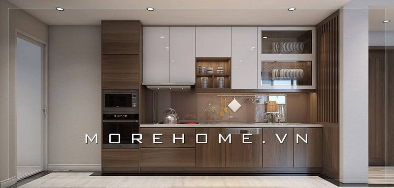 Tủ bếp gỗ việt được kiến trúc sư Morehome thiết kế với những đường chỉ viền cánh đẹp mắt