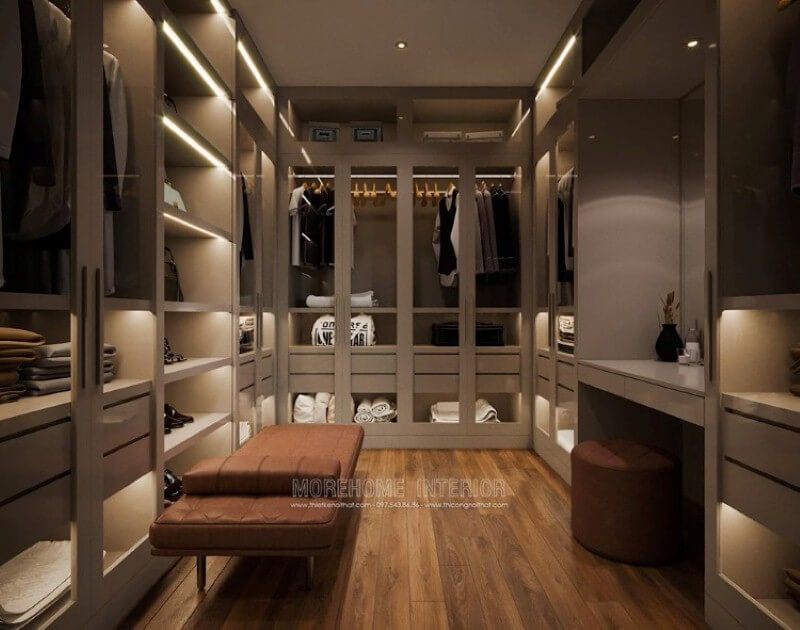 Hệ thống tủ nhựa acrylic với tủ gỗ công nghiệp tạo nên khu vực lưu chứa đồ đạc rộng lớn.