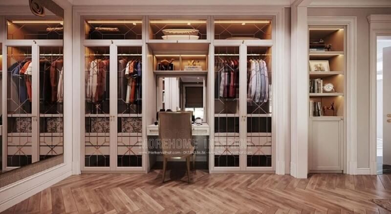 Tủ quần áo hiện đại vừa làm bàn trang điểm vừa để đồ trang trí vừa tận dụng không gian để quần áo với cửa 4 cánh cùng hệ tủ để đồ trên khá ngăn nắp giúp phòng ngủ trở nên gọn gàng, đẹp nhưng vẫn toát lên vẻ sang trọng, độc đáo.