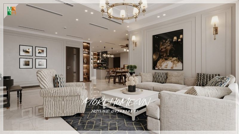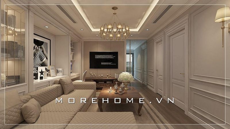 Sofa bọc vải nhung mềm mại màu trắng được thiết kế theo kiểu văng tiện lợi với phong cách tân cổ điển sẽ góp phần tạo nên cảm giác ấm cúng và tiện nghi thoải mái cho không gian phòng khách chung cư.