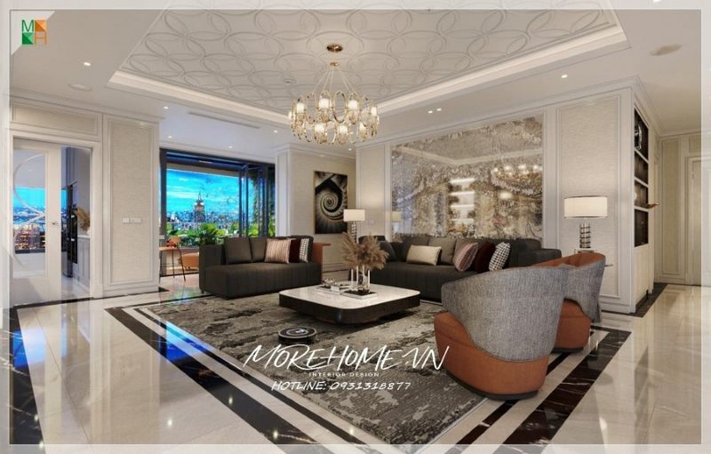 Những chiếc ghế đơn, ghế sofa tối màu, chiếc bàn hình vuông mặt đá màu trắng được sắp xếp kết hợp ăn ý nhất để tạo ra phòng khách chung cư một cách trọn vẹn nhất. Nơi xảy ra những cuộc gặp gỡ, tụ họp các thành viên trong nhà, ấm cúng, hạnh phúc.