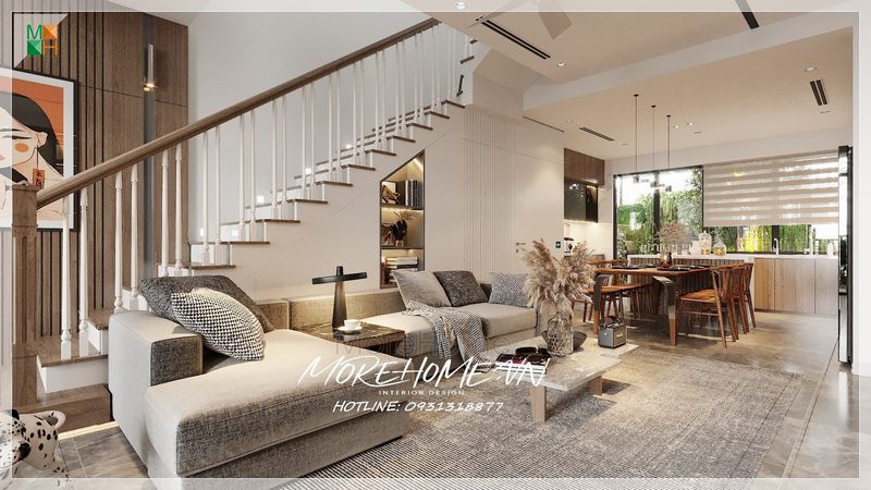 Thiết kế nội thất phòng khách liền phòng ăn theo phong cách gỗ việt tạo nên nét sang trọng và tiện nghi cho các thành viên trong gia đình trong không gian sinh hoạt chung