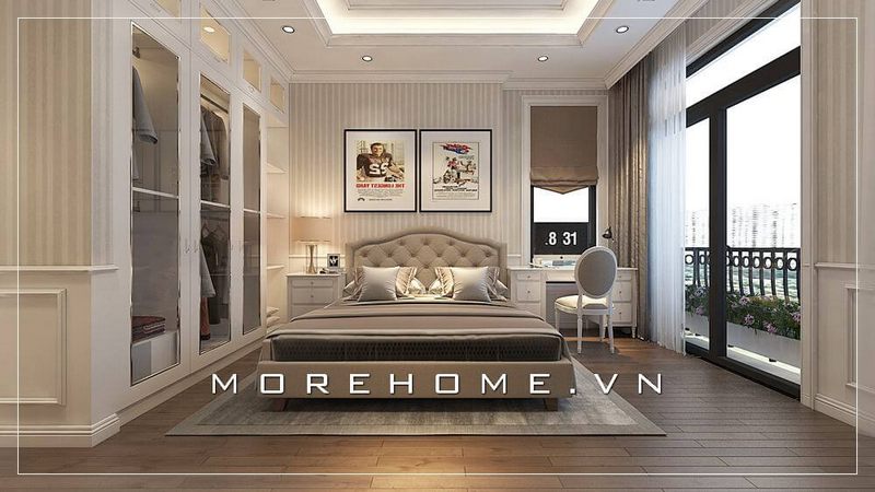 Thiết kế phòng ngủ chung cư cao cấp phong cách tân cổ điển, những đường cong tỉ mỉ, tinh tế tạo nên cảm giác sang trọng và đẳng cấp hơn cả