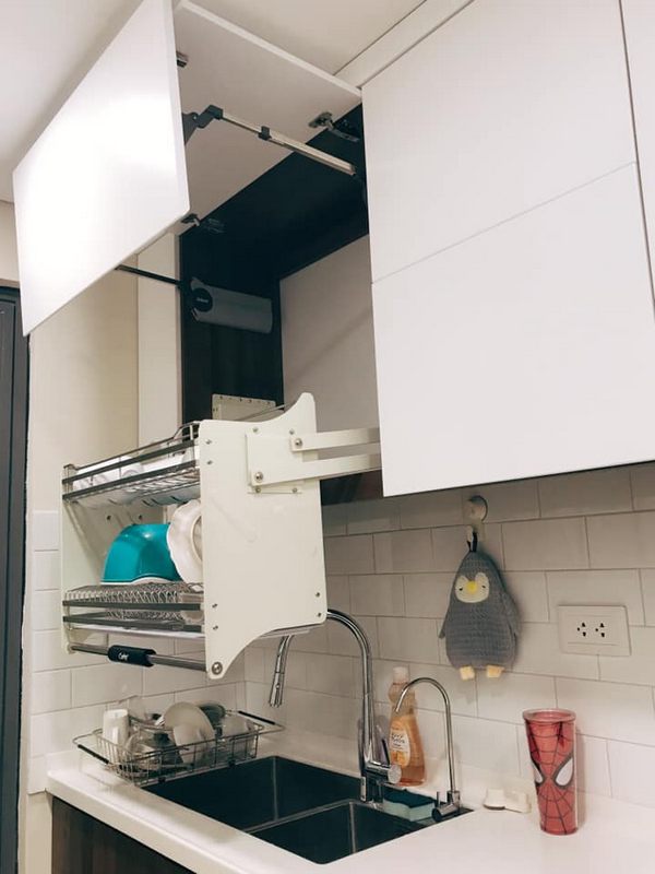 Đối lập với sắc trắng của không gian nội thất phòng bếp của căn hộ là màu đen cao cấp của kính ốp bếp - Điểm nhấn ấn tượng của cả căn phòng.