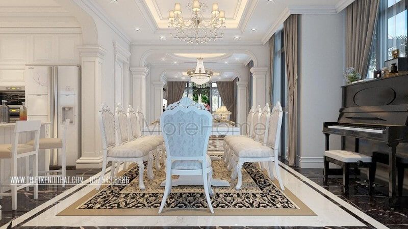 Mẫu bàn ăn biệt thự đẹp phù hợp với những gia chủ ưa thích sự sang trọng nhưng không quá rườm rà, tạo linh hoạt trong quá trình sử dụng của gia chủ