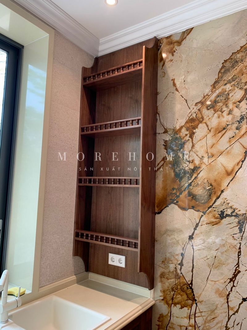 Tủ bếp gỗ óc chó được thiết kế trên mặt bằng có nhiều góc cạnh, nhưng vẫn đảm bảo được về công năng, tiện ích và thông minh.