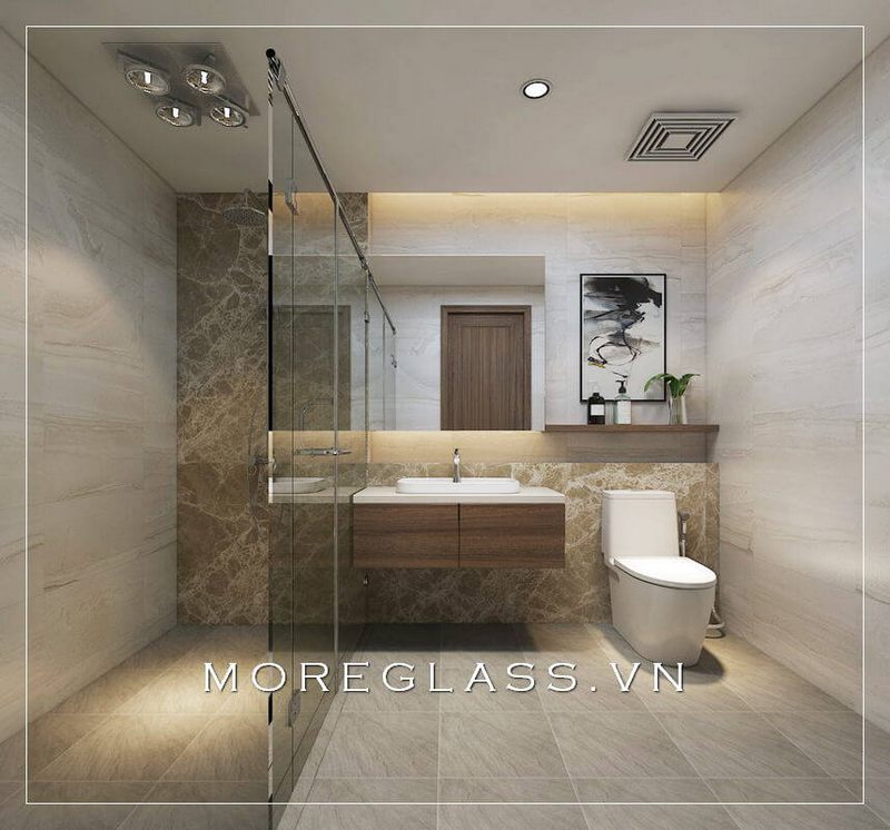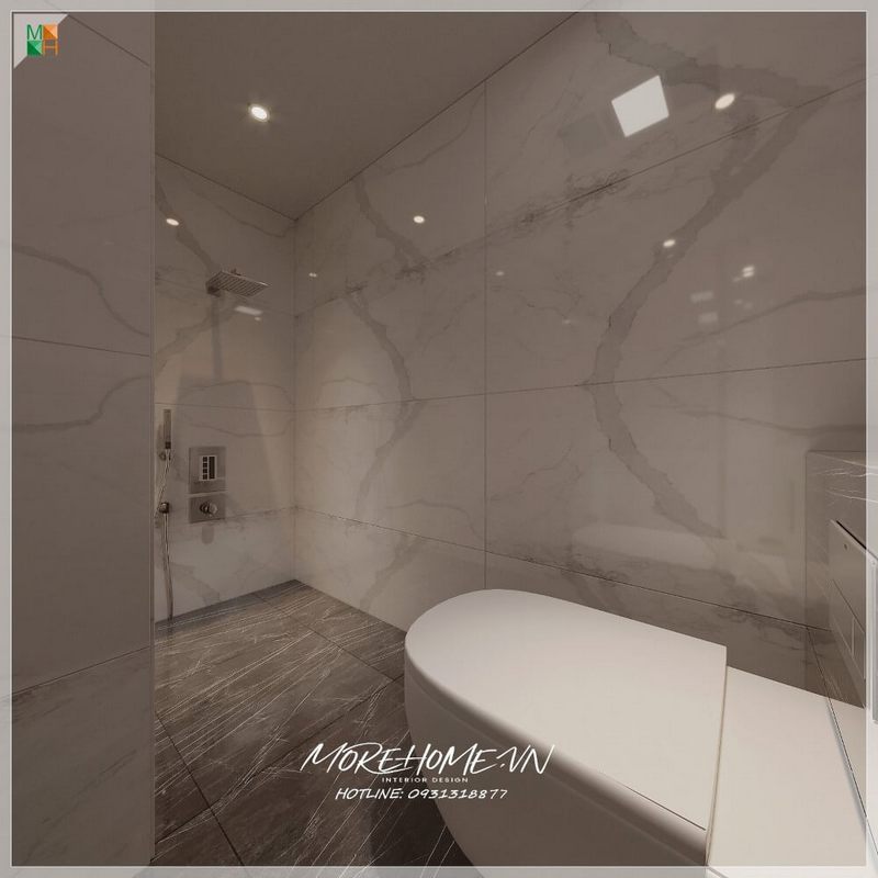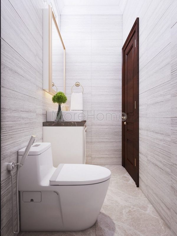 Thiết kế phòng tắm với diện tích không được rộng nội thất lựa chọn với tông màu sáng tạo cảm giác không gian được nới rộng thông thoáng.
