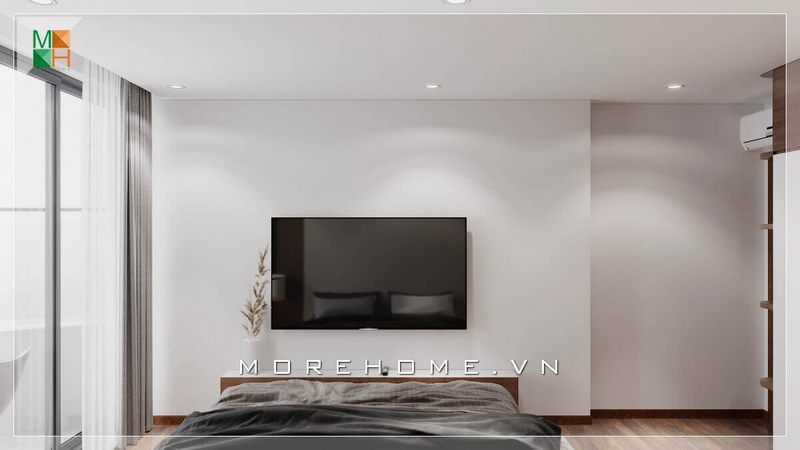 Mẫu thiết kế phòng ngủ cho chung cư, nhà phố, biệt thự mang phong cách hiện đại, với thiết kế tivi treo tường, khác với vẻ cổ điển của các kệ tivi truyền thống. Hơn nữa, kệ tivi này còn có thể để sách, đồ nghe nhìn và các món đồ trang trí nữa, giúp cho căn phòng luôn gọn gàng và đẹp mắt.