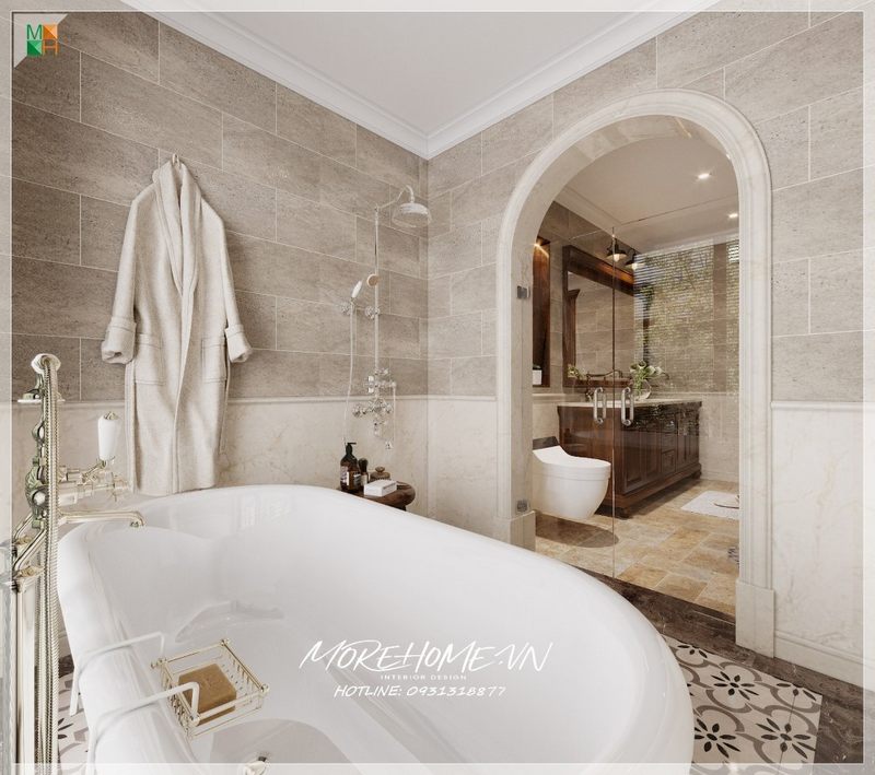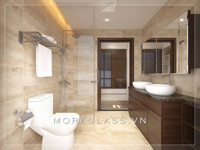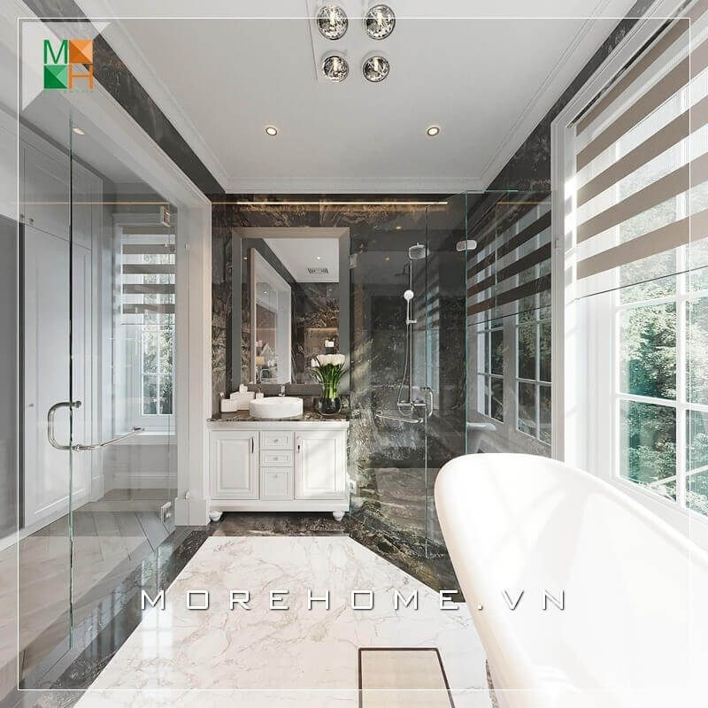 Không gian tắm biệt thự, nhà phố sang trọng với sự sử dụng của đá ốp lát cao cấp và kính ngăn hiện đại trẻ trung là một cảnh quan tuyệt vời và ấn tượng.