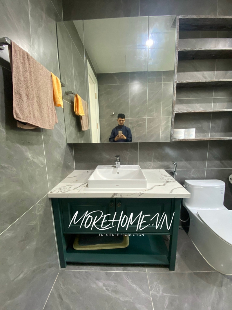 Tủ lavavbo có mặt bàn đá đen được thiết kế hiện đại và đầy thẩm mỹ.