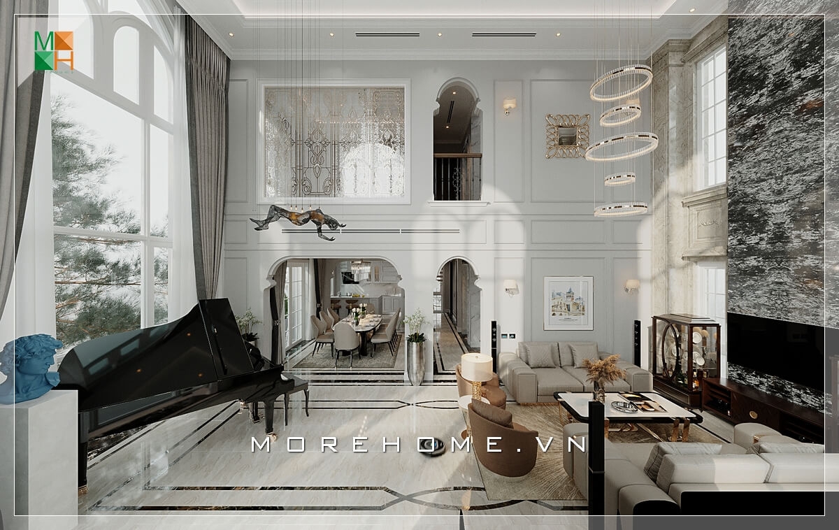 Thiết kế nội thất phòng khách rộng với gam màu trung tính thể hiện được nét đẳng cấp và sang trọng của cả ngôi nhà
