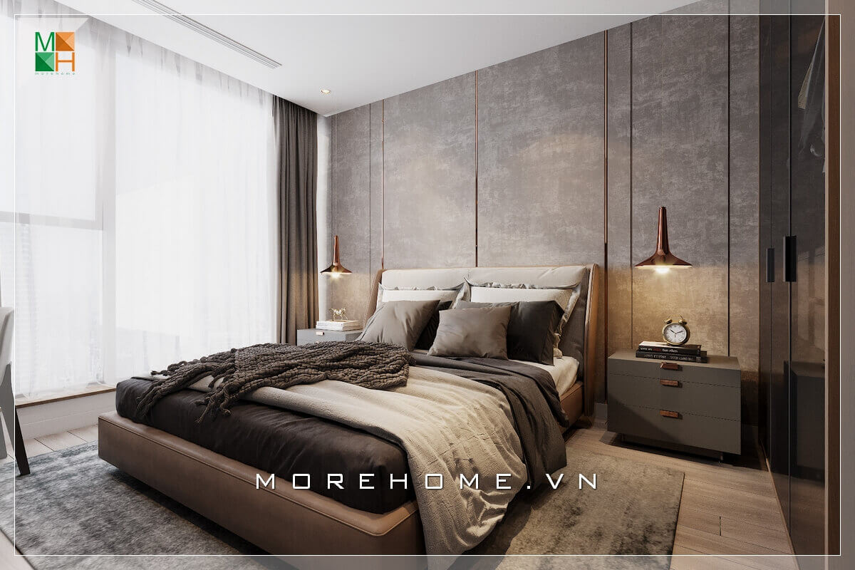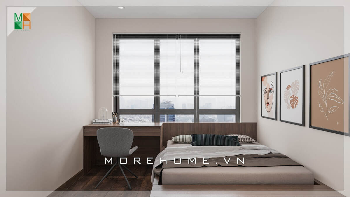 Giường ngủ liền bàn làm việc tông màu nâu trầm phong cách hiện đại, sử dụng ánh sáng tự nhiên nhờ thiết kế cửa sổ lớn bằng kính cường lực, giúp không gian căn phòng được mở rộng hơn