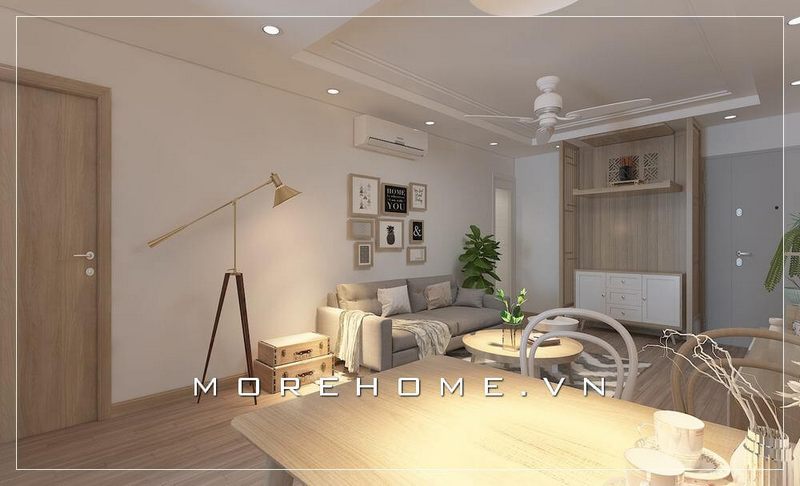 Thiết kế phòng khách đẹp cho căn hộ chung cư Thăng Long Number One hướng sáng, đón trọn vẹn ánh sáng tự nhiên từ khung cửa rộng mang đến sức sống và sự tươi trẻ cho căn phòng